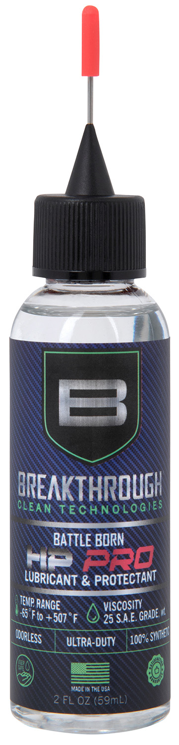 The Breakthrough Clean Technologies Battle Born HP PRO Lubricant and Protectant is a blend of high quality, 100% synthetic gun cleaning oils. This anti-rust, anti-foam, non-toxic, odorless lubricant is treated with extreme pressure and anti-wear additives to provide ultimate and lasting corrosion protection and lubrication under a broad range of temperatures (from -65F to 507F).