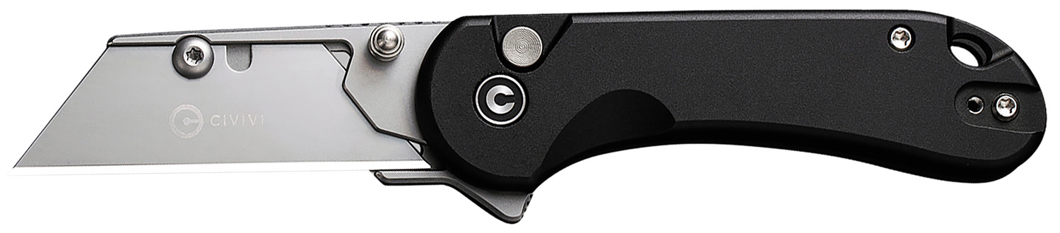 Civivi all purpose Elementum utility knife with a flipper thumb stud opening and button lock. Includes three extra blades, pocket clip, extra screw, nylon storage pouch, cleaning cloth, stickers and instructions.