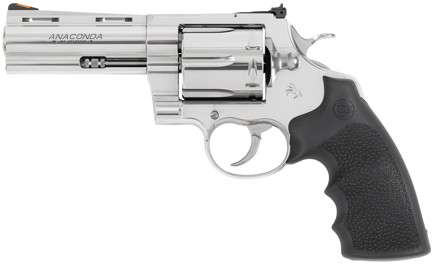 The Anaconda has been fully re-designed to utilize an oversized Python action. Bulked-up with a solid stainless steel frame for strength and durability, this DA revolver is worthy of its pedigree. Experience the Linear Leaf Spring action for a non-stacking, smooth-as-glass trigger pull. With recoil-absorbing Hogue grips and adjustable, interchangeable sights. A recessed target crown offers protection and the frame is drilled and tapped for optics mounts.