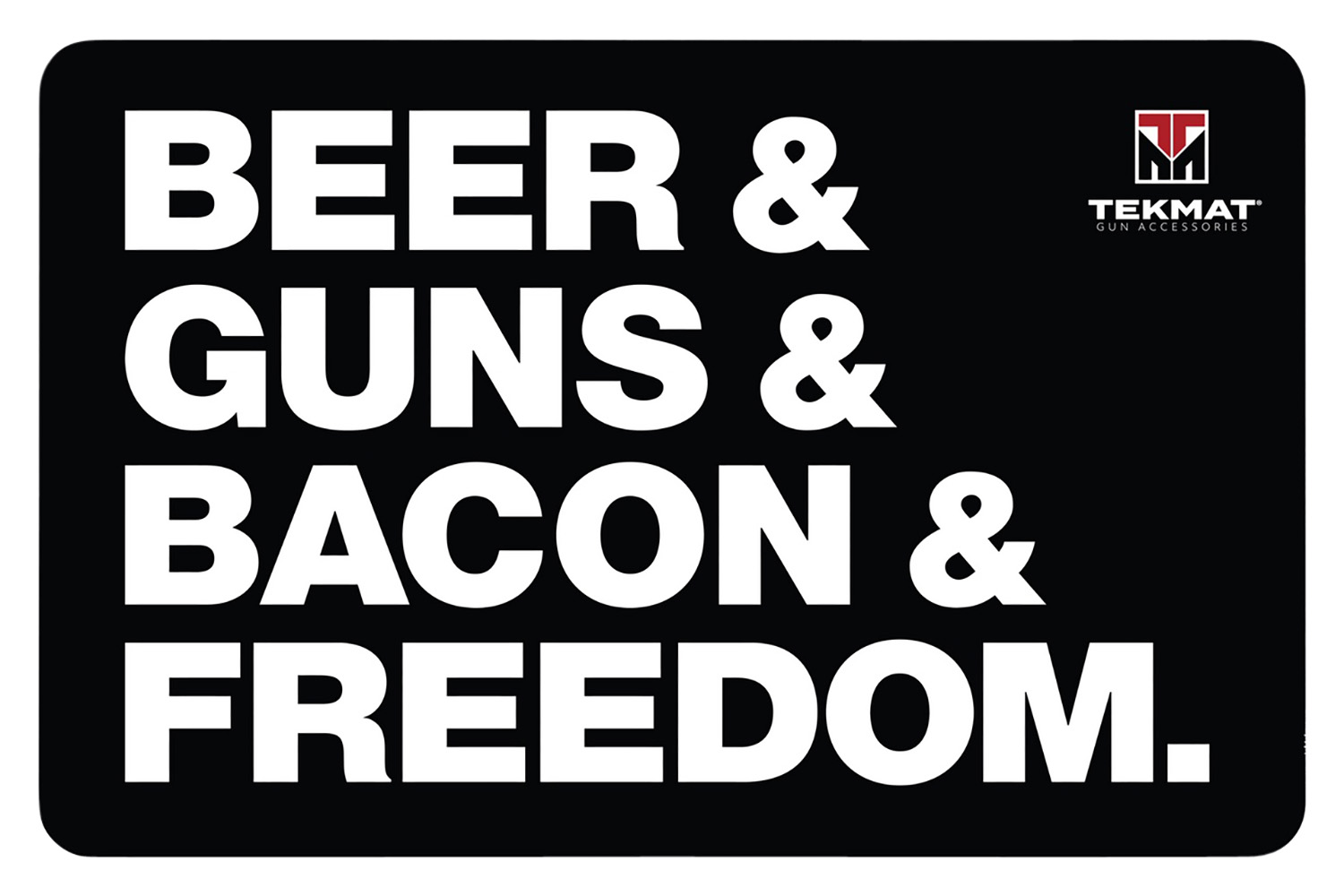 TekMat Gun Mat “Beer & Guns & Bacon & Freedom”, rubber substrate will ensure the gun mat does not slide around while the vulcanized rubber will give the mat some padding. All of these materials are weather resistant and will stand the test of time.